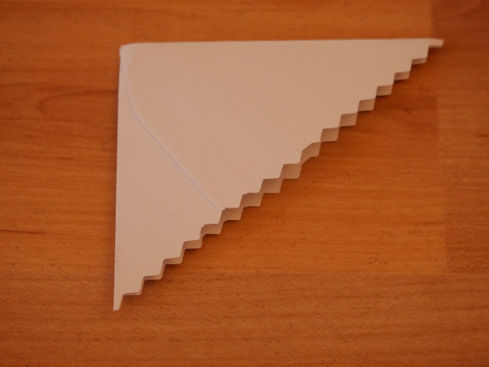 This first one is an easy one. I've seen this everywhere, magazines, websites and videos. This one is fun, because you can add eyes and teeth at the end to make it look like a monster. OK, so here's how to do it: First, get an envelope. Secondly, cut off one of the corners to make a right angle shape. I cut mine with zigzag scissors so that it made a pattern on the edge. I did a white envelope, but if you can find a red or blue or any other colour that would look even better. Here is what mine looked like: